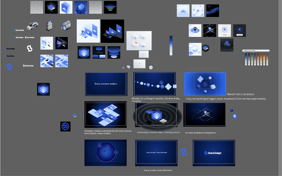 The piece focuses on translating complex ad-tech systems into clear, energetic motion using an abstract visual language. It combines 2D motion design, a simple 3D environment, and AI-generated visuals to explore rhythm, structure, and scalability while staying aligned with StackAdapt’s brand system. Process: Concept development → sketch exploration → styleframes → motion design and final animation